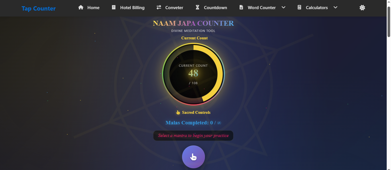 The Naam Japa Counter on TapCounter.in is a free, web-based tool designed to track mantra repetitions, prayers, or affirmations. It serves as a digital mala, offering a user-friendly interface for spiritual seekers, meditators, and anyone needing a reliable counting mechanism. Key features include: